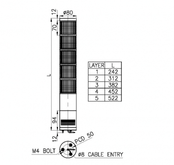 自立型,发出5种信号音的标准型LED多层信号灯 安装Ø80x70mm的大型灯罩,易于向远距离传递信号光