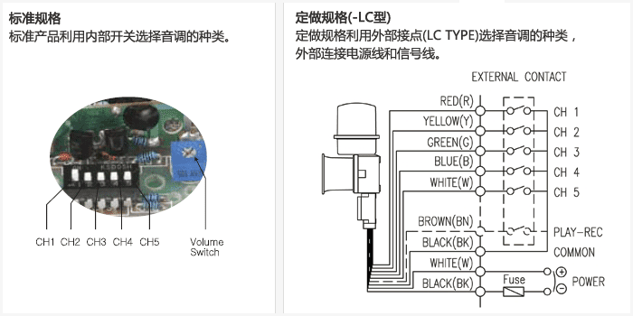 WS-警告音 5音 WP-特殊警告音 5音 WM-音乐音 5音 WA-警报音 5音 WV-声音信号 3频道 |